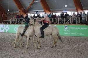 В конно-спортивной школе поселка Актюбинский прошли соревнования по борьбе на лошадях.