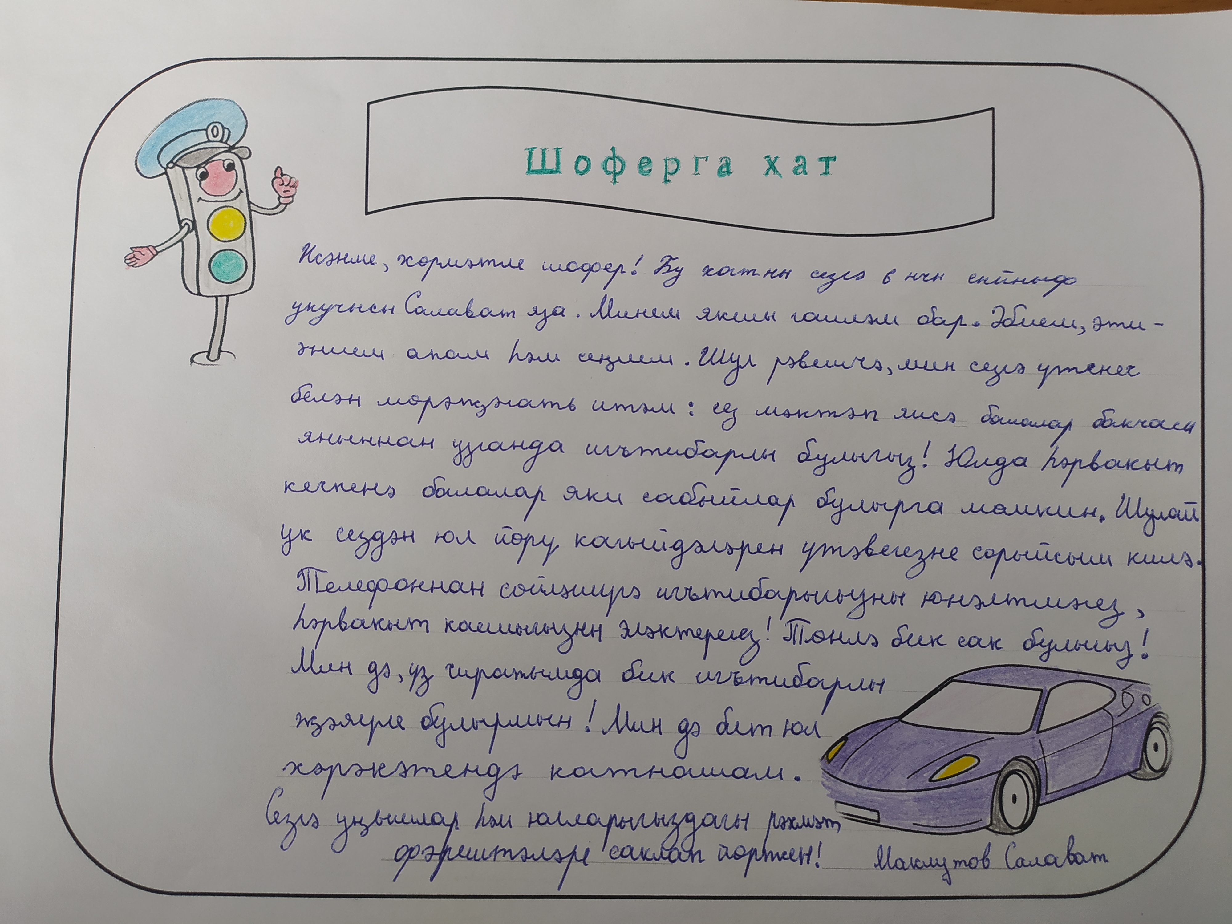 Миңа бигрәк тә «Шоферга хат» акциясе ошый. Хатны язар алдыннан түгәрәк җитәкчебез Фәсимә Хазиахметовна белән бергәләп җыелып киңәшләшәбез, планлаштырабыз, нинди мәсьәләләргә игътибар итәргә кирәклеге хакында уйлашабыз. Бергәләп шоферларга хат язабыз, язган хатларны укыйбыз, отышлырак эчтәлеклеләрен хат итеп формалаштырабыз. Менә бер хатнын фотосүрәтен сезгә дә тәкъдим итәм.